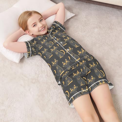 senya Cat Reflection Black Satin Summer Pajama Sets Silk Short Sleeve Button Down Sleepwear 1
