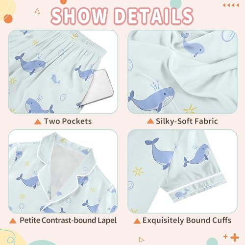 Cute Cartoon Blue Whale Summer Satin Pajama Set, Cute Button-Down Sleepwear Pj Set for Sleep Wears 3