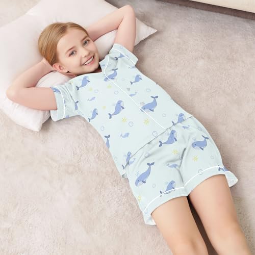 HOT ! Cute Cartoon Blue Whale Summer Satin Pajama Set, Cute Button-Down Sleepwear Pj Set for Sleep Wears
