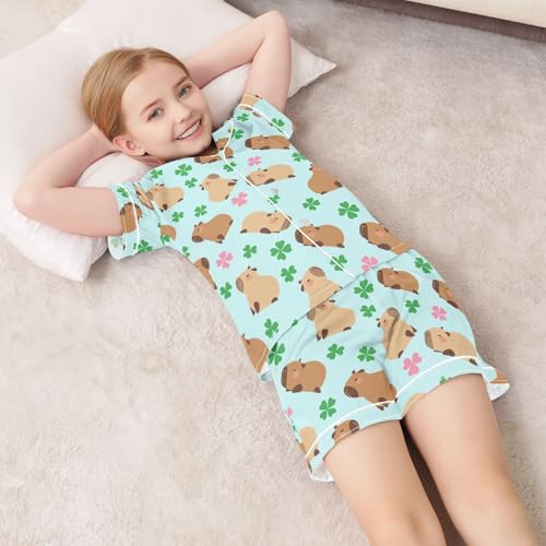 Capybara with Lucky Clover Blue Summer Satin Pajama Set, Cute Button-Down Sleepwear Pj Set for Sleep Wears 6
