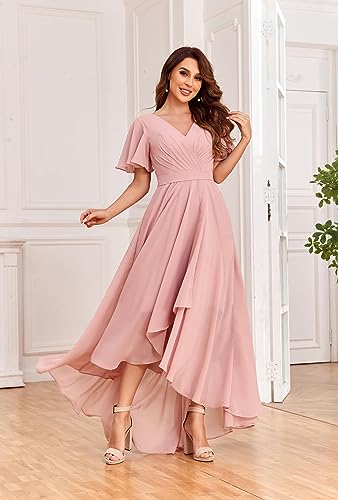 Women's High Low Bridesmaid Dresses for Women Chiffon Pleated V Neck Short Sleeves Formal Gown with Slit 5