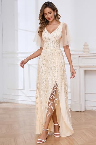 • Cloth Feature: Ruffle Sleeves A-line Mother of The Bride Dresses for Wedding, Hi-Low V-Neck Mother of The Groom Dresses for Women, Floor Length, Evening Cocktail Party Gown with Side Slit, Glamorous Shimmery Sequins Prom dress,Elegant Lace Appliques Formal dresses.