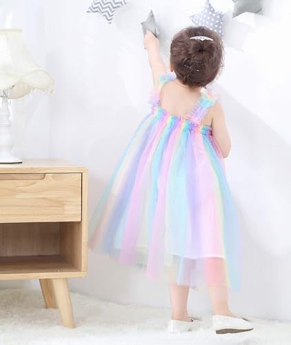 • ★Design: sleeveless, square neck, pull on, elastic bust, multi-layer lace tutu dress, colorful rainbow, sequin star print, above knee length.Using soft mesh, due to folding and transportation issues, it may appear wrinkled. Ironing it will look the same as the picture.