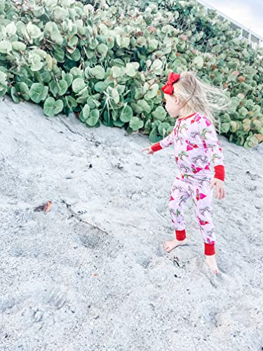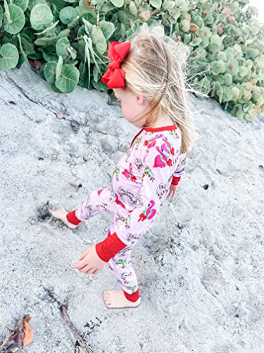 • Your kiddos will be ready for the Christmas season in our vibrant Fa La La Mingo pink and red pajamas featuring palm trees adorned with red Christmas lights and flamingos with santa hats. They are sure to add to the Christmas spirit!