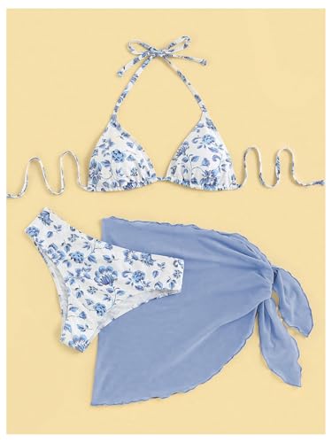SHENHE Women's 3 Piece Floral Bikini Set with Wrap Coverup Halter Triangle Swimsuits 3