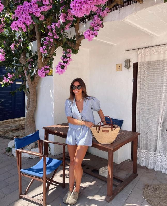 Yuemengxuan Women Y2k Peplum Shirt Shorts Set Two Piece Lounge Set Pajamas Sets Puff Sleeve Tie Front Top 2pcs Pj Outfits 6