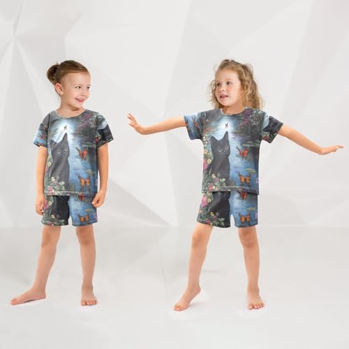 ALAZA Black Cat Kitten Butterfly Flower Pajamas Set Short Sleeve Cotton Sleepwear Summer Pjs 2 Piece 5-14Y 1