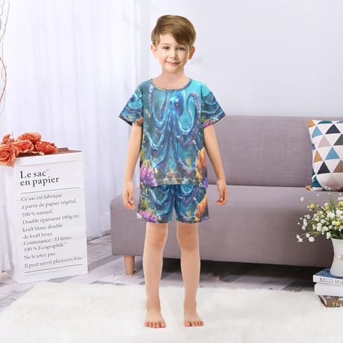 ALAZA Blue Octopus Shark Coral Reef Pajamas Set Short Sleeve Cotton Sleepwear Summer Pjs 2 Piece 5-14Y 3