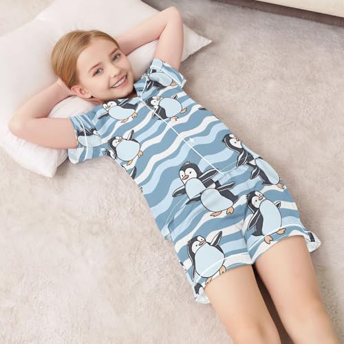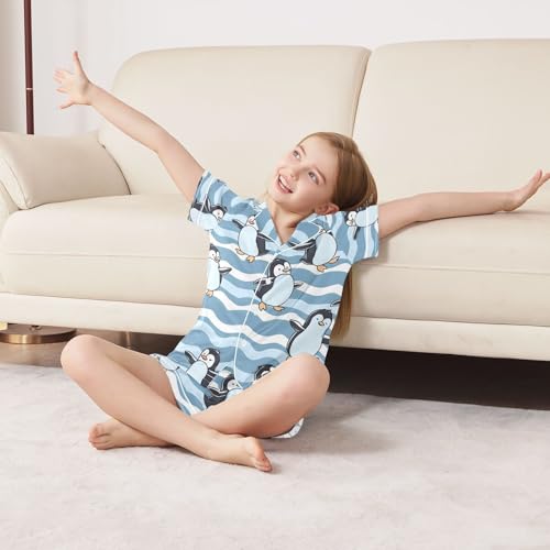 ALAZA Dancing Penguin Wave Pajamas Satin Pajama Set Short Sleeve Button Down Sleepwear 3