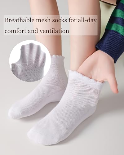 Girls White Ruffle Socks 6 Pairs,Girls Ankle Socks for School Uniform Seamless Cotton Dress Sox 4-6/6-8/9-12 Years 5