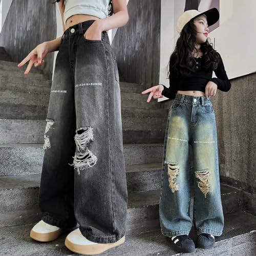 Girls Ripped Jeans Casual Elastic Waist Wide Leg Baggy Pants Kids Clothes 5-14 Years 6