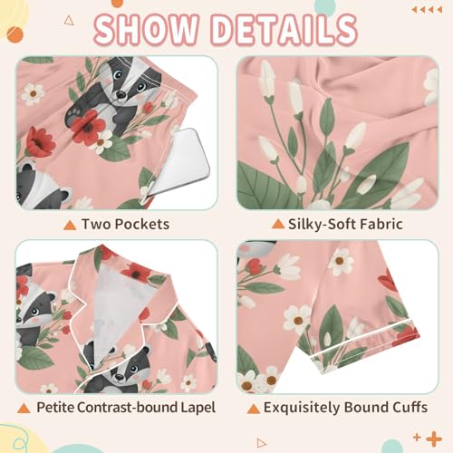 Satin Pajama Sets Short Sleeve Cute Badgers Among Flowers Pattern Button Down Silky Nightwear 2 Piece PJS 5-14Y 5
