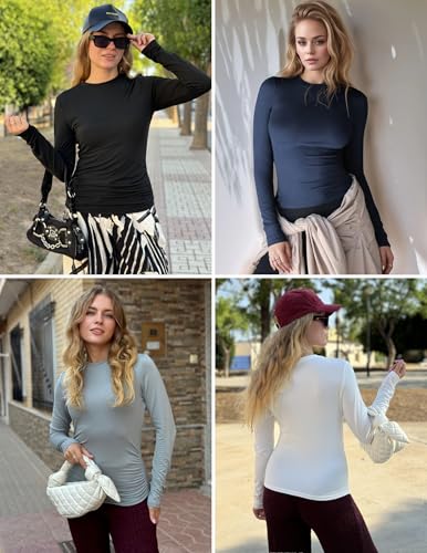 Ekouaer Women Long Sleeve Shirts Ruch Side Thermal Tops Crew Neck Layering Undershirts Stretchy Slim Fit Basic Tees 5
