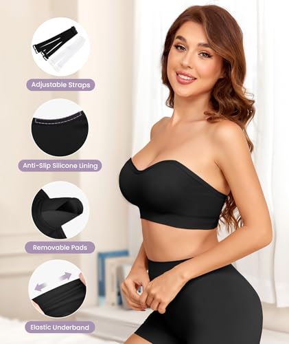 Strapless Bras for Women Padded Wireless Bandeau Bra with Clear and Fabric Straps Non-Slip Grip Tube Top Bralette 3