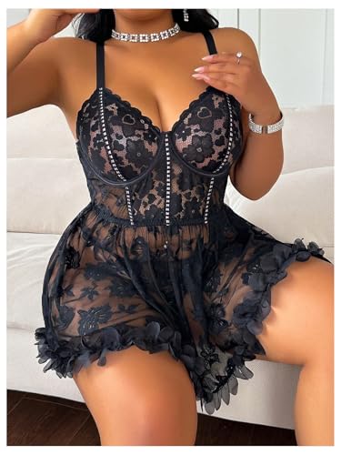 More information about Women's Plus Size 2 Piece Babydoll Lingerie Sets Floral Lace Sheer Mesh Ruffle Nightdress with Panty