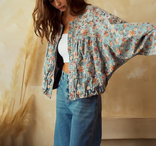 More information about chouyatou Women's 2025 Fall Boyfriend Floral Denim Jacket Spring Y2K Casual Oversized Jean Bomber Jacket