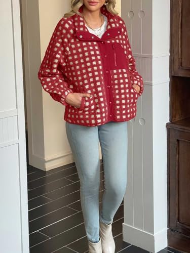 Tankaneo Womens Plaid Sherpa Jacket Fuzzy Fleece Stand Collar Button Down Jacket Winter Warm Outerwear 2