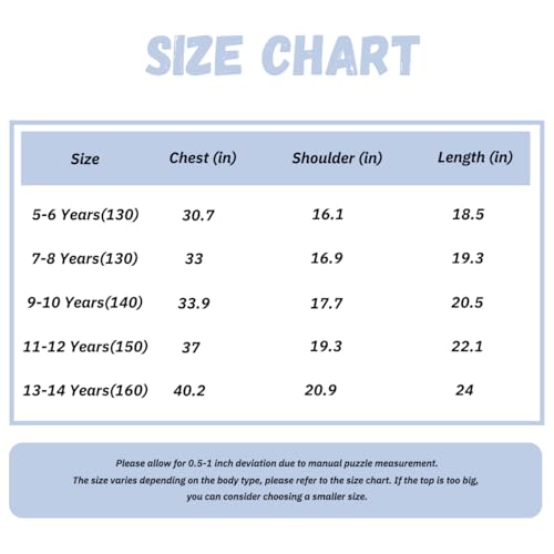 • Size : Chest (in) : Shoulder (in) : Length(in) ; 5-6Y : 30.7 : 16.1 : 18.5 ; 7-8Y : 33 : 16.9 : 19.3 ; 9-10Y : 33.9 : 17.7 : 20.5 ; 10-12Y : 37 : 19.3 : 22.1 ; 13-14Y : 40.2 : 20.9 : 24 . Please allow for a 0.5-1 inch deviation due to manual puzzle measurement. The size may vary depending on the body type, please refer to the size chart.