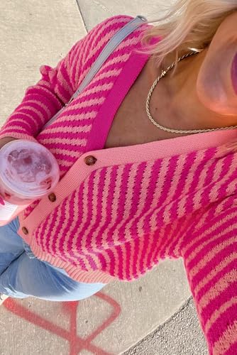 HOT ! Women's Pink Striped Buttoned V Neck Drop Shoulder Cardigan - Elegant Fall Sweater
