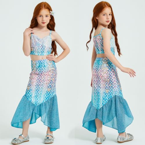 Mermaid Girls Bathing Suit 3Pcs Sequin Top, Bikini Bottoms Fish Tail Swimsuit Kids Beach Pool Swimwear 3-12Y 3