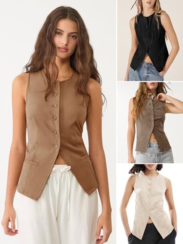 Tankaneo Womens Sleeveless Vest Trendy Suede Button Down Business Casual Suit Vest Tops Blazer Waistcoat 6