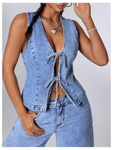 More information about MakeMeChic Women's Tie Front Denim Vest Deep V Neck Sleeveless Crop Denim Top