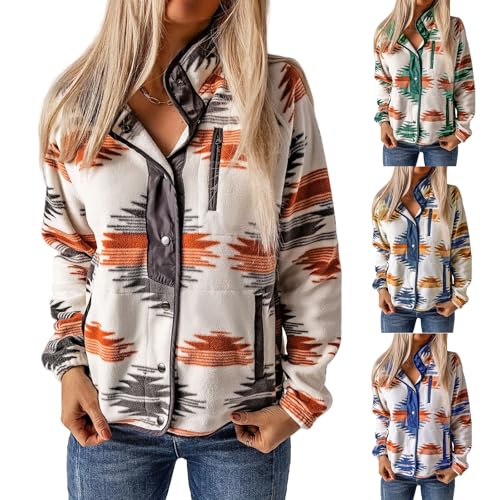 HOT ! Womens Western Aztec Print Jacket Fleece Button Down Jackets Long Sleeve Snap Coat Fall Fashion Coat with Pockets