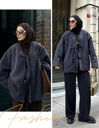 • Design: Loose fit fuzzy jacket features bow tie front, fuzzy knit, v-neck, long sleeve, drop shoulder, loose fit, oversized bow jacket for women, vintage wool blend coat 2024 fashion.