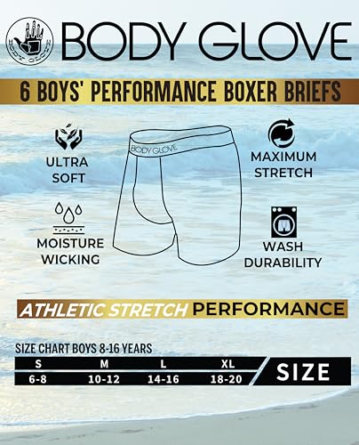 • 4 PACK: Body Glove's performance boxer briefs for boys come in a pack of four, featuring athletic performance underwear with a some fun prints and solid colors as well. Available in S-XL sizes – find the size suitable for your active child, ensuring a perfect fit for every young athlete.