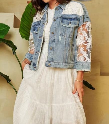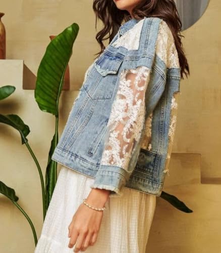 More information about Women's Fall Denim Jackets Lace Embroidery Patchwork Ripped Jean Jackets Button Down Frayed Outwear Coat