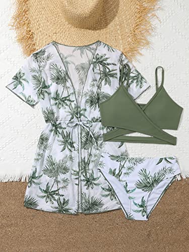 COZYEASE Girls' 3 Piece Swimsuits Tropical Spaghetti Strap Criss Bikini Bathing Suit with Cover Up 4