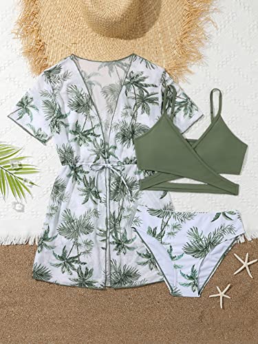 COZYEASE Girls' 3 Piece Swimsuits Tropical Spaghetti Strap Criss Bikini Bathing Suit with Cover Up 3