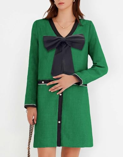 More information about Women's Tweed Bow Mini Dress Long Sleeve V Neck Button Down Elegant Business Work Dress
