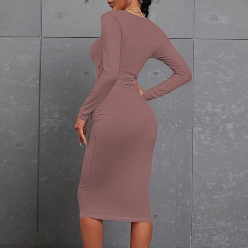 Women's Fall Fashion Sexy Slim Pleated Long Sleeve Dress Basic Round Neck Work Office Pencil Skirt Club Party Dresses 5