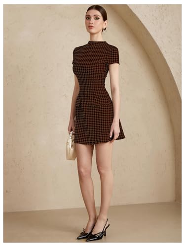 Women's Houndstooth Mock Neck Dress Short Sleeve Flared A Line Work Office Dresses 1