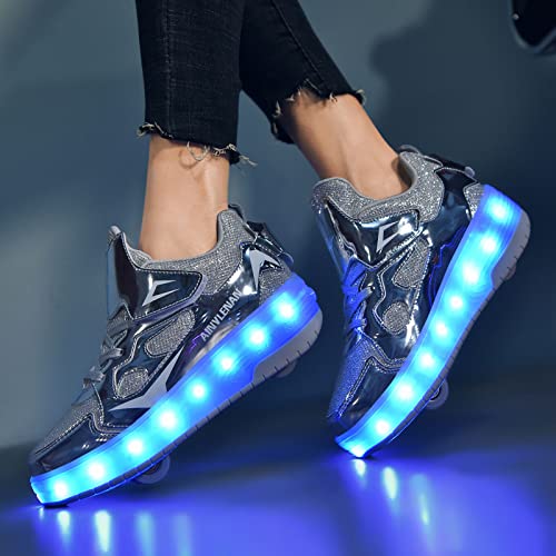 EMDPBD Roller Skates Shoes USB Charging, Unisex Kids LED Light Up Retractable Roller Skate Sneaker Flashing Wheel Shoes for Girls Boys,Silver-3.5BigKid 3