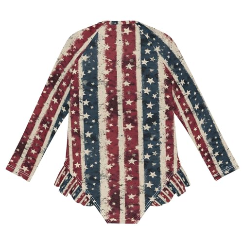 ALAZA Retro Striped Star American Flag Girls One Piece Swimsuit Long Sleeve Rashguard Swimsuit UV 50+ Swimwear Zip 1