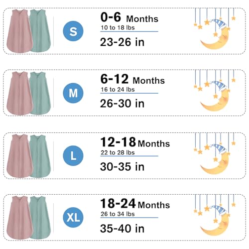 • 【Baby essentials】Baby sleep sacks can help your baby get a longer, more restful night's sleep. They come in 4 sizes, , S for 0-6 Months, M for 6-12 Months, L for 12-18 Months, and XL for 18-24 Months. Each Blanket is backed with 60-Day Money-Back Guarantee. You are welcomed to have a try.