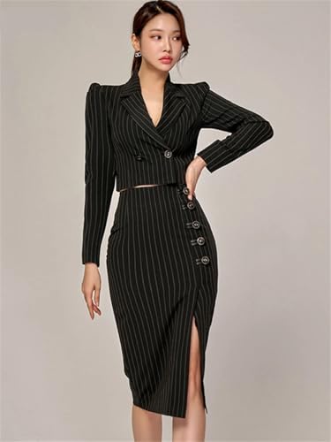 Women Stripes Occupation 2-Piece Suits Elegant Blazer Pencil Skirts Korean Casual Set 1