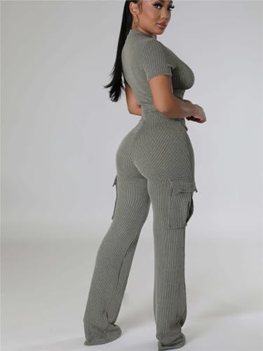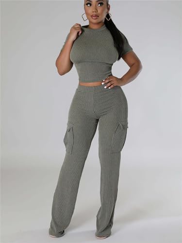 CALEBGAR Women 2 Piece Outfits Sexy Wide Leg Cargo Pants Sets Short Sleeve Ribbed Tops 5
