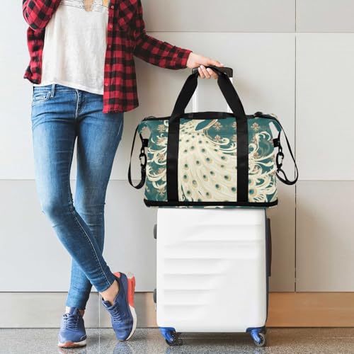 HOT ! Retro Victorian Style White Peacock Green Sports Tote Gym Bag Overnight Carry On Tote and Luggage with Adjustable Strap for Airplane Traveling Large Capacity